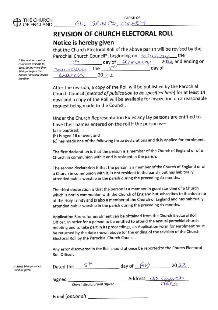 Application Forms for enrolment can be obtained from the Church Electoral Roll Officer. In order for a person to be entitled to attend the annual parochial church meeting and to take part in its proceedings, an Application Form for enrolment must be returned by the date shown above for the ending of the revision of the Church Electoral Roll by the Parochial Church Council. Any error discovered in the Roll should at once be reported to the Church Electoral Roll Officer.