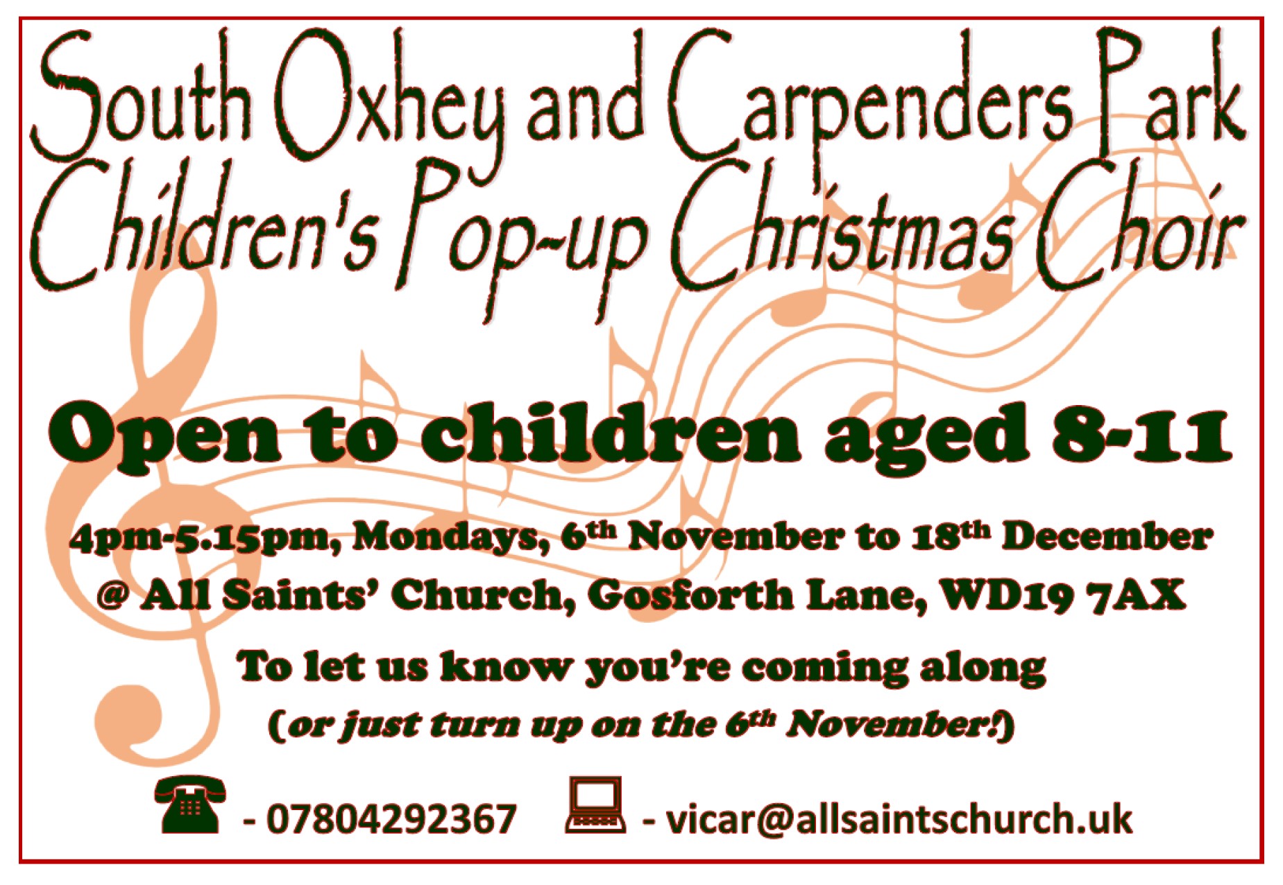 - Practices will be led by The Rev’d Deborah Snowball – Vicar of South Oxhey and Carpenders Park – former Primary School Music Teacher
