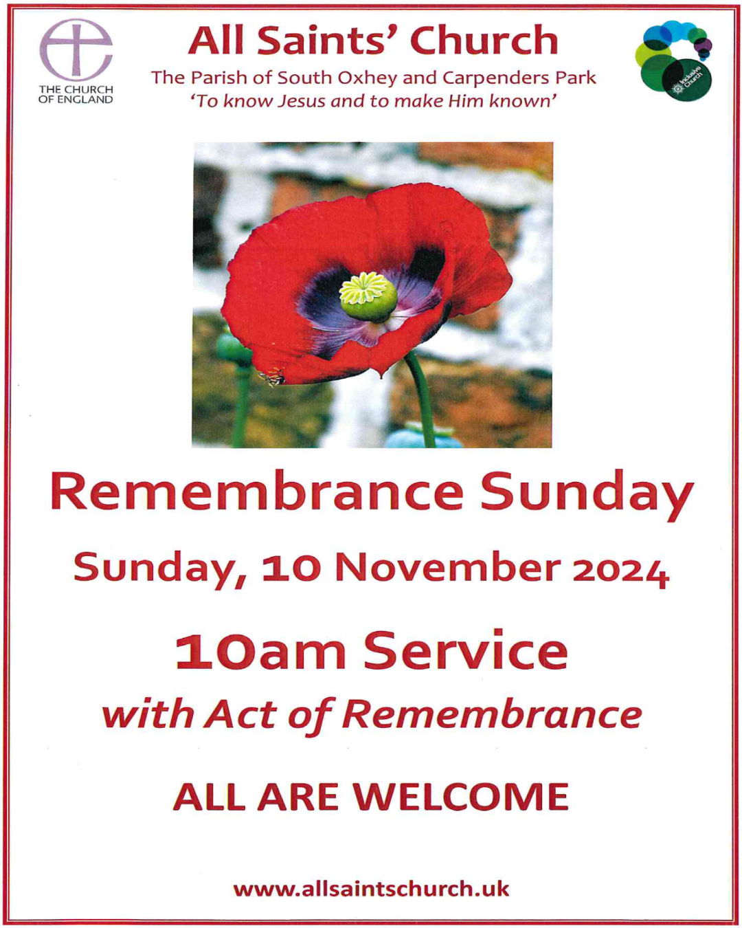 All are welcome to join us on Remembrance Sunday. Our 10am Service will conclude with an Act of Remembrance as we mark those who have given their lives in conflicts across the world. As part of this Service, we also pray for peace.